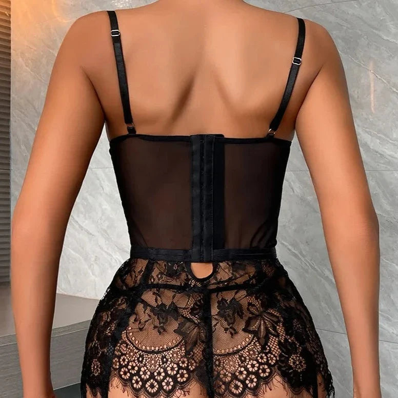 - Koronkowy body odsłaniający ciało w zmysłowy sposób