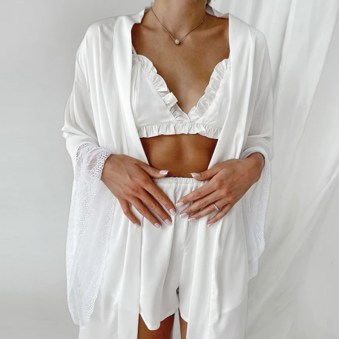 - Zestaw piżamowy Mirala składa się z biustonosza, szlafroka i spodenek