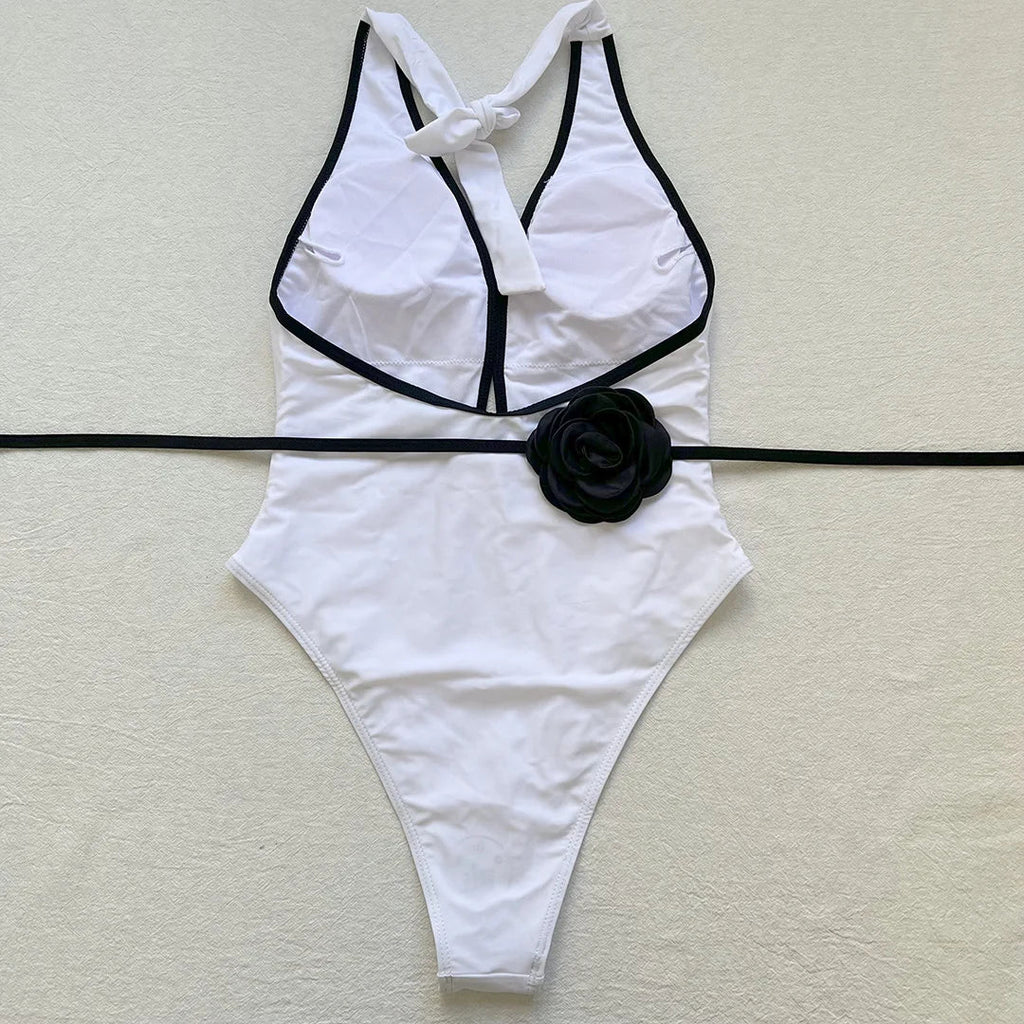 - Jednoczęściowy strój kąpielowy z elegancką ozdobą w postaci róży